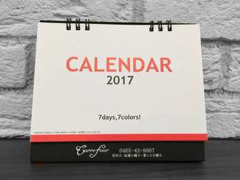 2017オリジナルカレンダー 2016.12.01 皆様こんにちは(^-^) Carre fourオリジナルカレンダーが出来上がりました。 便利な卓上サイズをご用意しております! ご来店のお客様全員にプレゼント! 数に限りがございますので無くなり次第終了とさせて頂きます! ぜひご活用下さい。 Post Share Hatena Pin it 12月のお休み! クリスマスムードにチェンジ!