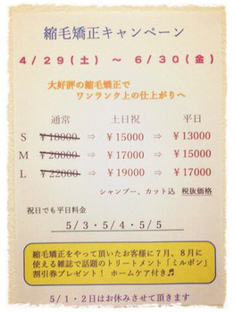 梅雨前に! 2017.04.30 皆様こんにちは(^-^) 今回は当店看板メニュー縮毛矯正キャンペーンのお知らせです。 梅雨が来る前の今の時期にかけて頂くと、ストレスなく梅雨を迎えれると思います。 また、今回は土日祝と平日で料金が異なります。 お得な平日がオススメ! ただ、ゴールデンウィーク中の3日、4日、5日は平日料金でやらせて頂きます。 予約も徐々に埋まってきてますので早めのご予約をお待ちしております! Post Share Hatena Pin it フレンチスパ 5月16日のお話 その1!